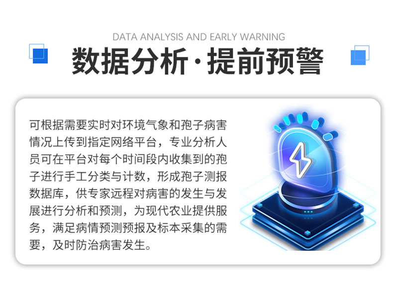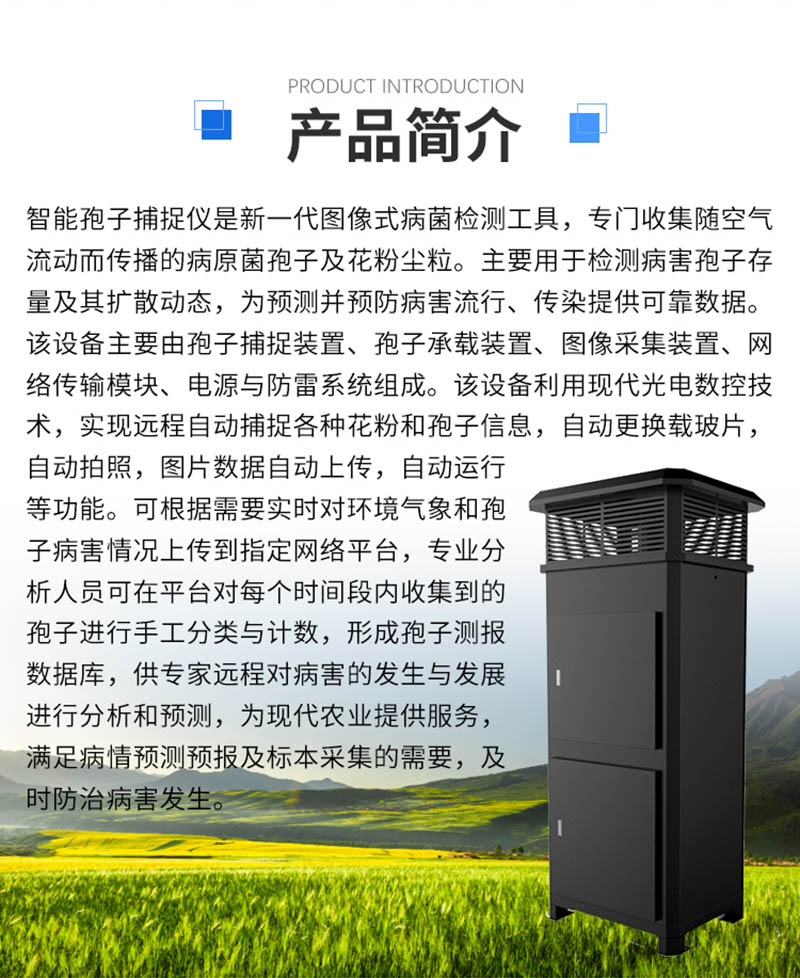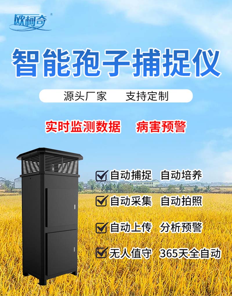 智能孢子捕捉仪是新一代图像式病菌检测工具,专门收集随空气流动而传播的病原菌孢子及花粉尘粒。主要用于检测病害孢子存量及其扩散动态,为预测并预防病害流行、传染提供可靠数据。该设备主要由孢子捕捉装置、孢子承载装置、图像采集装置、网络传输模块、电源与防雷系统组成。该设备利用现代光电数控技术,实现远程自动捕捉各种花粉和孢子信息,自动更换载玻片,自动拍照,图片数据自动上传,自动运行等功能。可根据需要实时对环境气象和孢子病害情况上传到指定网络平台,专业分析人员可在平台对每个时间段内收集到的孢子进行手工分类与计数,形成孢子测报数据库,供专家远程对病害的发生与发展进行分析和预测,为现代农业提供服务,满足病情预测预报及标本采集的需要,及时防治病害发生。