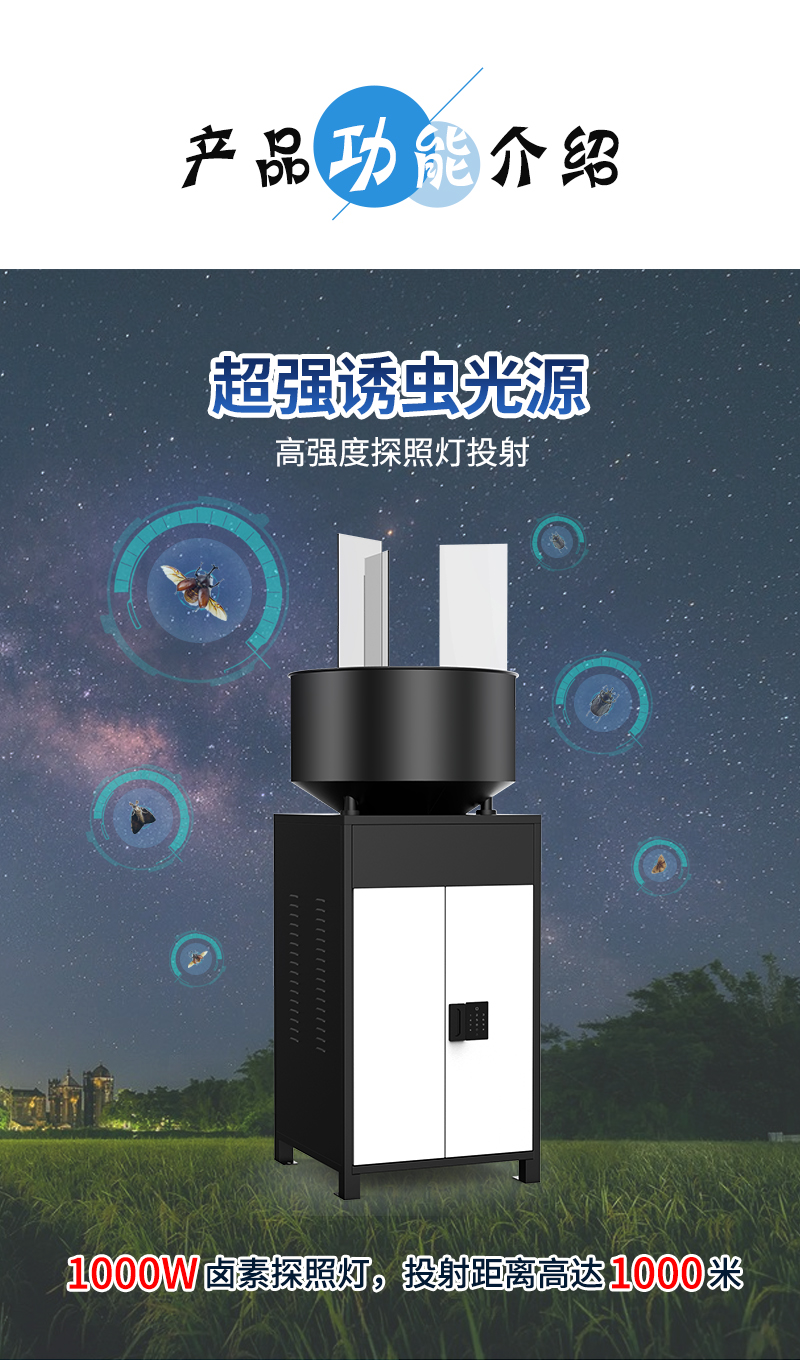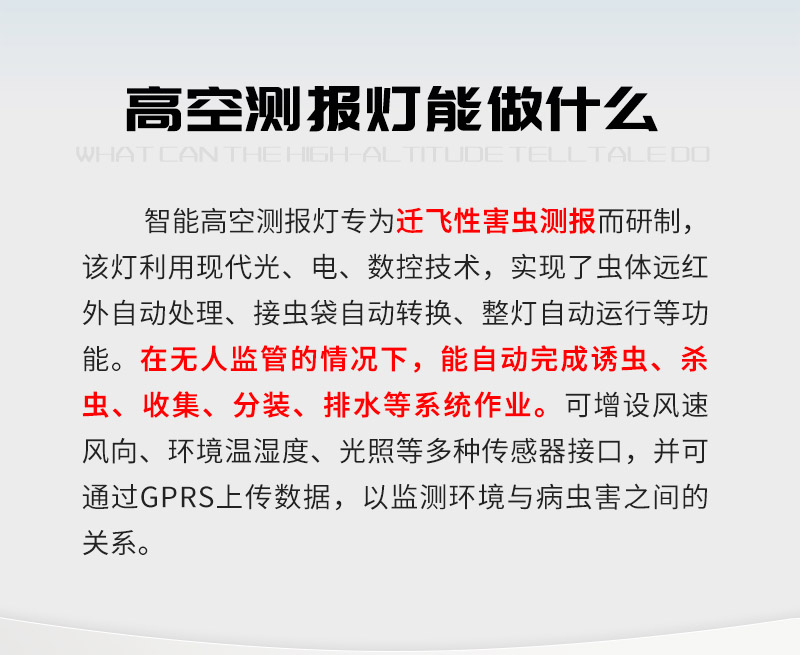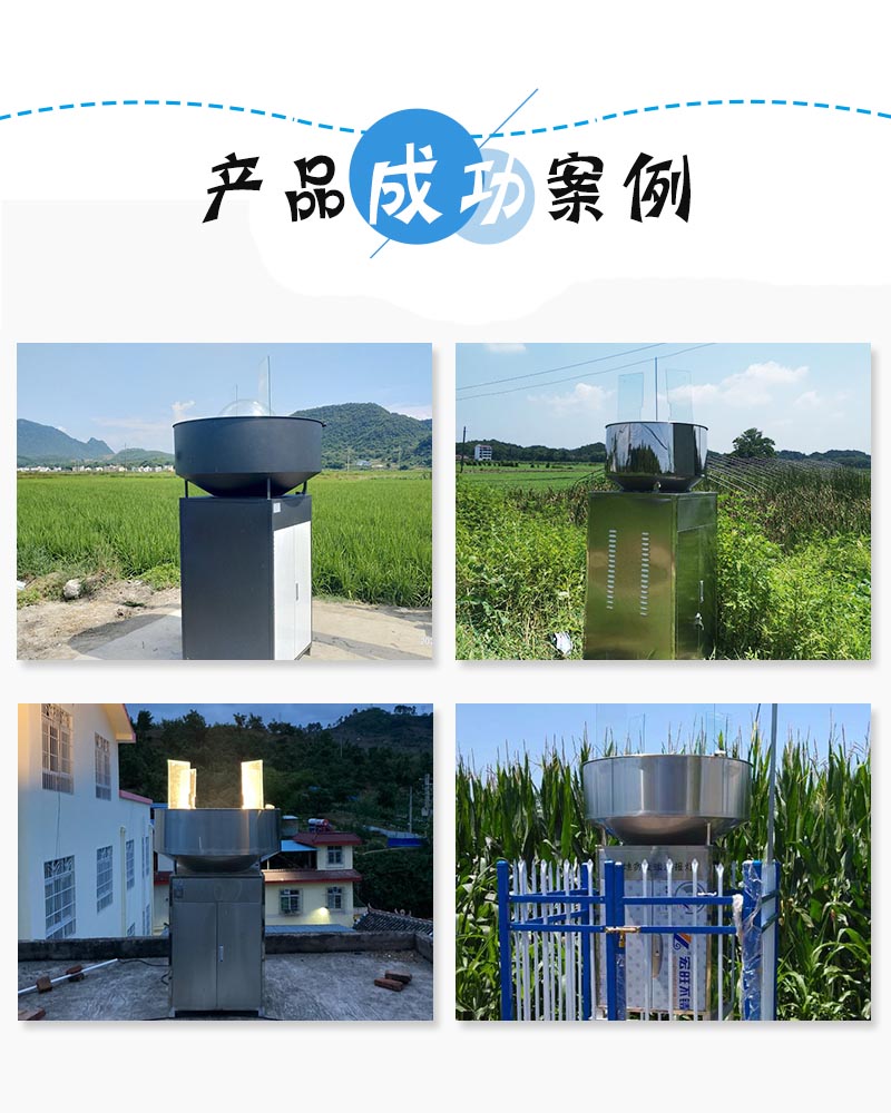 智能高空测报灯专为迁飞害虫测报而研制,该灯采用高强度探照灯投射为诱虫方式,投射距离高达1000米,弥补了传统测报灯对迁飞型害虫诱虫能力不足的缺点。该灯利用现代光、电、数控技术,实现了虫体远红外自动处理、接虫瓶自动转换、整灯自动运行等功能。在无人监管的情况下,能自动完成诱虫、杀虫、收集、拍照,计数,分装、排水等系统作业。可增设风速风向、环境温湿度、光照等多种传感器接口,并可通过4G无线传输,以监测环境与病虫害之间的关系。