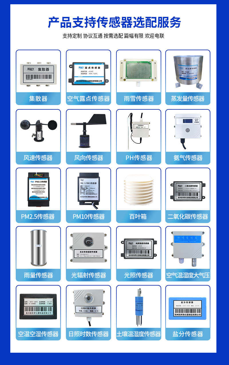 气象监测仪配备的传感器可以从1到25种任意组合,也可选配太阳能供电。