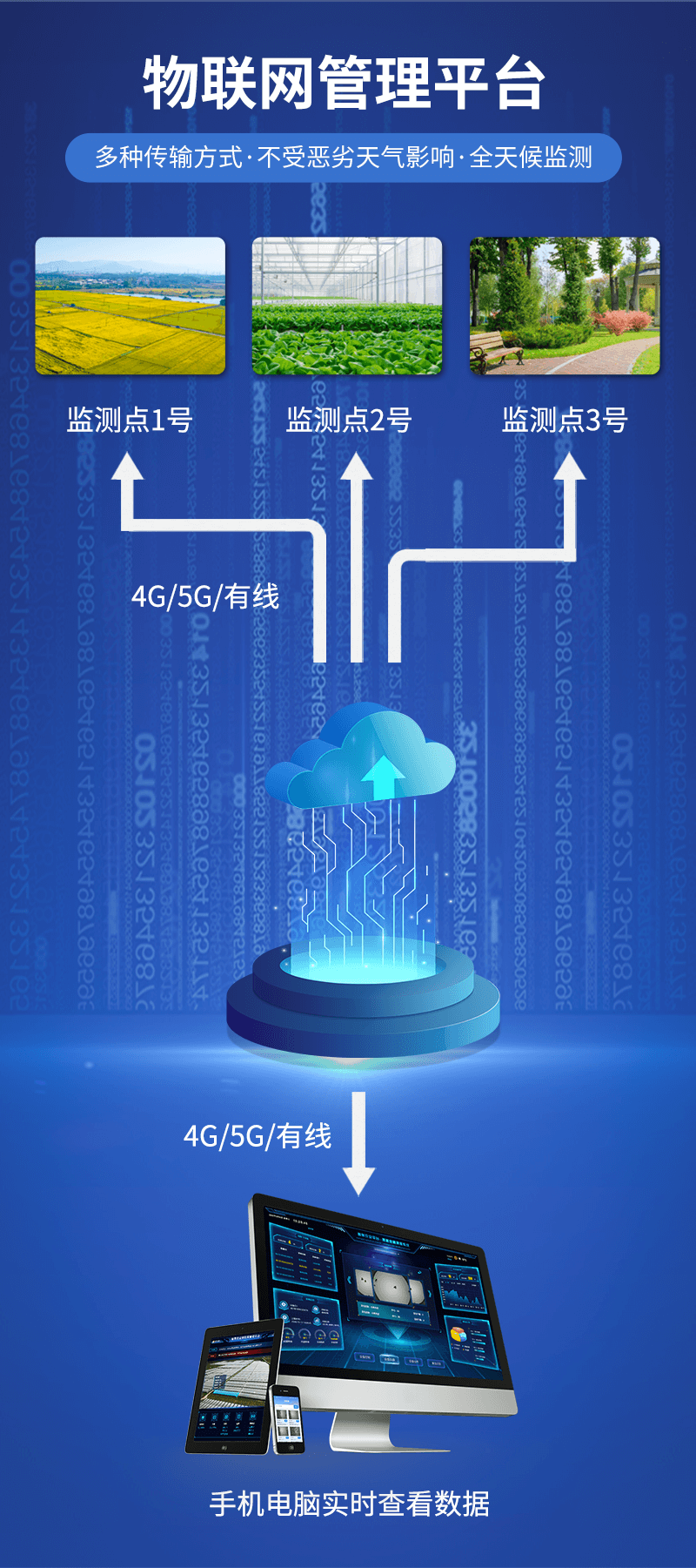 现场监测到的数据通过GPRS/2G/4G/5G网络发送到中心云平台,用户可登陆网页查看详细的墒情信息。数据稳定可靠,可及时反映环境中的各项参数状况,也可以定时将采集到的各种数据通过无线网络发送到管理人员的手机上,方便指导农业生产并有效形成气象灾害预警以便相关部门及时采取相关措施,降低灾害损失,特别适合无人长期观测农作物生长环境与现场状况的场合。