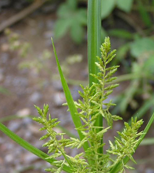 形态特征:秆丛生,直立,株高20—85cm,扁三棱状。叶基生,较秆短,叶鞘红褐色。苞片3—5,叶状,下部2—3片较花序长;长侧枝聚伞花序复出,有4—9条长短不一的辐射枝,每枝具5—10个穗状花序,个别3个,穗状花序长卵形,有小穗5—12个;小穗长圆形扁平,具花5—22朵;鳞片宽倒卵形,先端略缺,有短尖,背部有绿色龙骨状突起,两侧黄色;雄蕊、柱头各3个。小坚果三棱状倒卵形,黑褐色。靠种子繁殖。