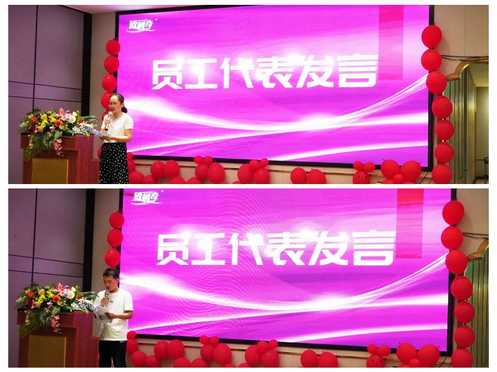 员工代表发言环节,新老员工代表分别讲述他们的故事,分享个人心路历程。一路走来他们有迷茫、有徘徊,但追随着欧柯奇的脚步,脚踏实地,开拓进取,最终收获了坚定的信念和更加优秀的自己。他们的精彩发言引起大家的共鸣,赢得阵阵掌声。