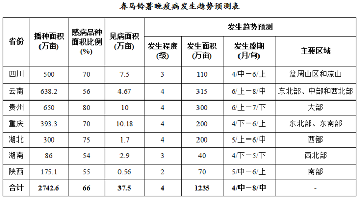 据气象部门预报,今年春季西南及武陵山区马铃薯产区大部气温比常年同期偏高,4月份,湖南、四川西部、贵州东部等地降水较常年同期偏多;且马铃薯种植区多为山区和丘陵地区,多雾多露,有利于马铃薯晚疫病发生。