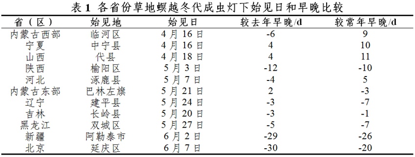 自4月中旬至6月上旬,西北、华北和东北地区10个省份灯下陆续始见越冬代成虫,不同区域之间始见期相差1个月以上。其中,内蒙古西部、宁夏、山西北部、陕西北部、河北北部等核心越冬区始见期为4月中旬至5月上旬,辽宁、吉林、黑龙江、新疆北疆和北京始见期为5月下旬至6月初。与去年同期相比,宁夏、山西偏早4天,其他大部地区偏晚4—30天;与常年同期相比,内蒙古西部以及宁夏、山西和河北的北部偏早5—11天,其他大部地区偏晚1—26天(详见表1)。
